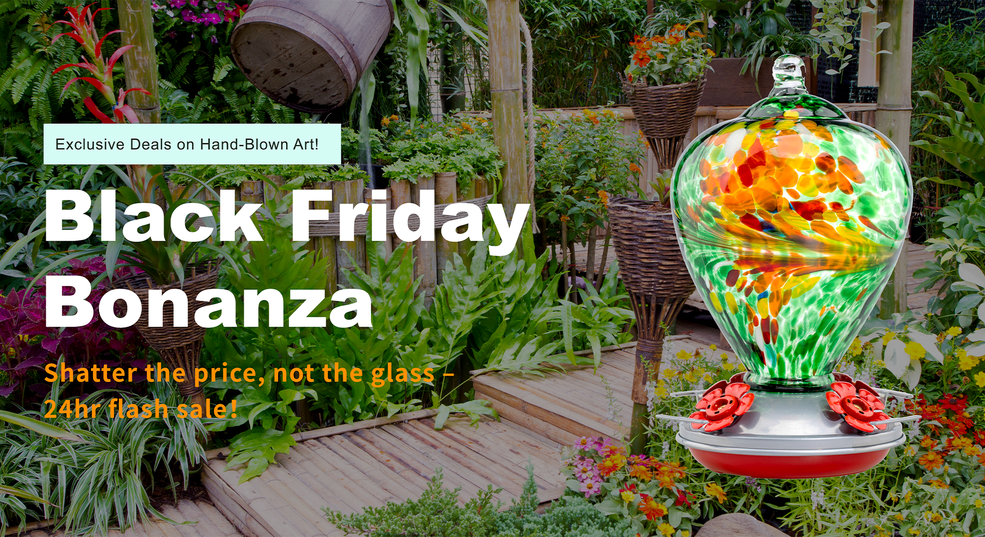 Muse Garden Hand Blown Glass Hummingbird Feeder - 27 Ounces - Fireworks